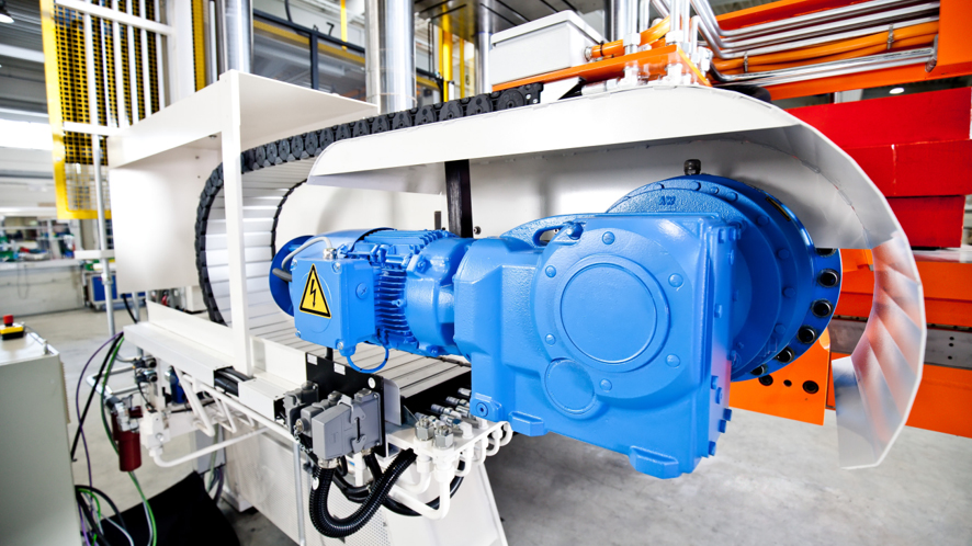 Flender hat aus seinem riesigen Industriegetriebeprogramm von ca. einer Million möglicher Kombinationsmöglichkeiten die optimale Gesamtlösung für den Hauptantrieb der Schiebe-Kipp-Tisch-Pressen von KUKA zusammengestellt.