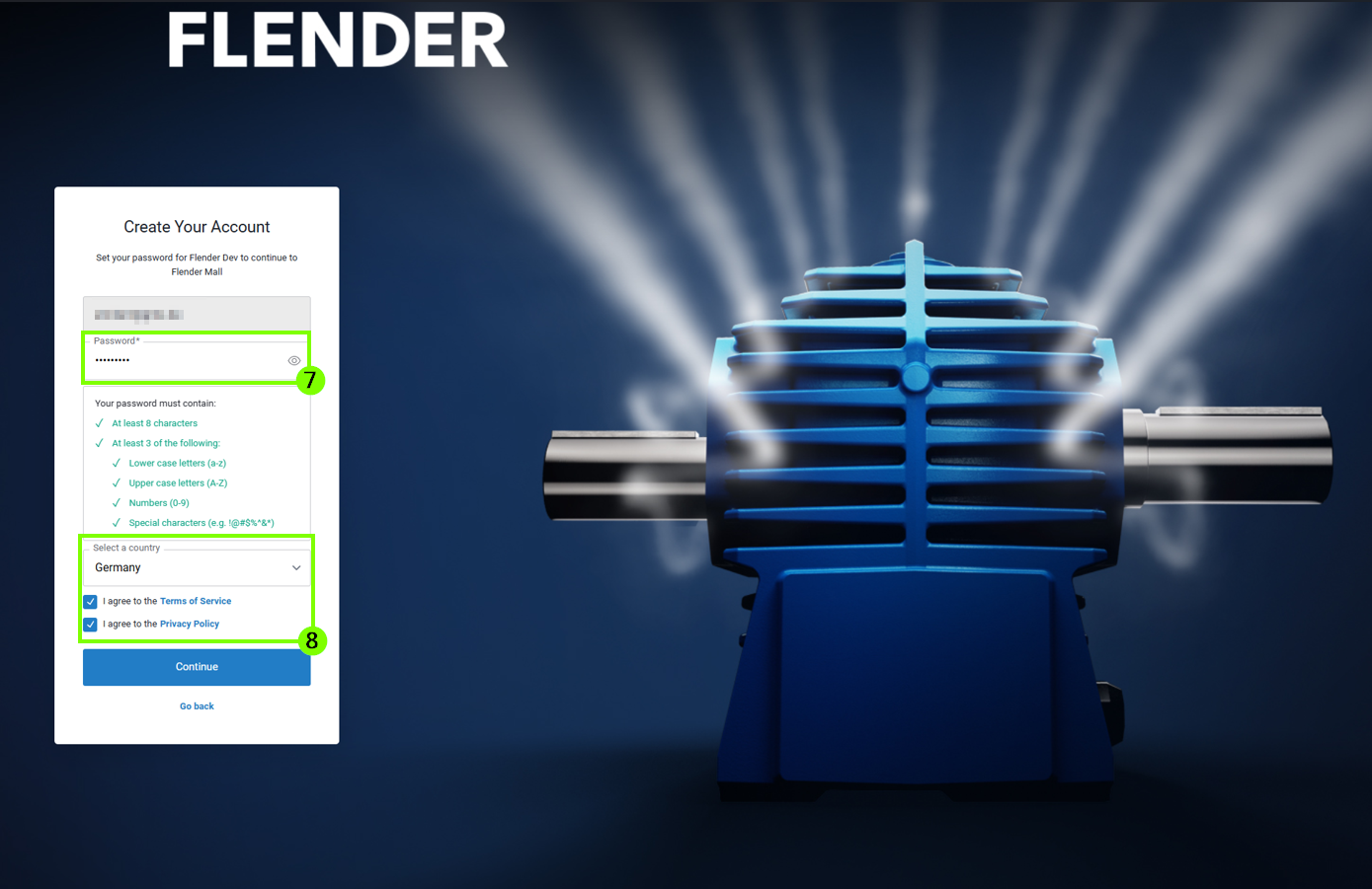 5. Afterwards, set a personal password (7). To continue the process, the terms of service must be accepted (8).