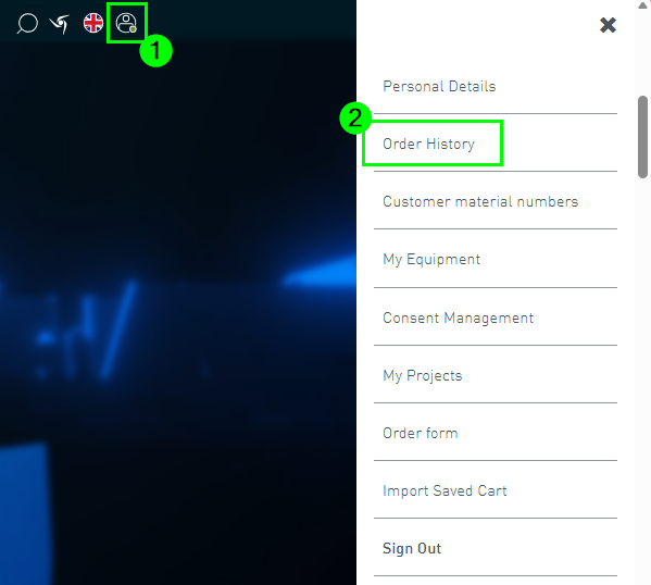 您可以通过用户菜单 (1) 进入订购表单 (2)