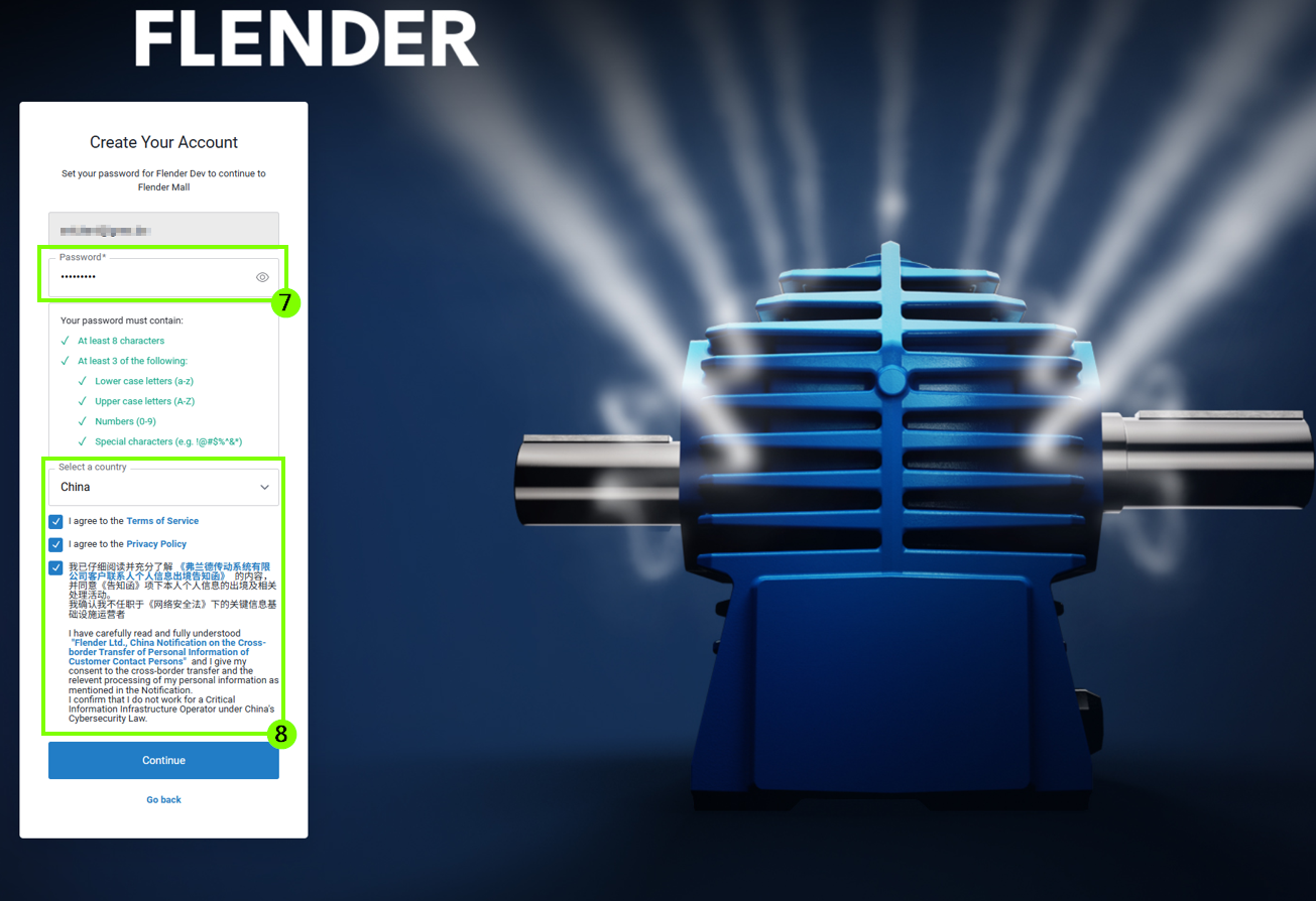5. 接下来,设置个人密码(7)。要继续操作,必须接受服务条款(8)。